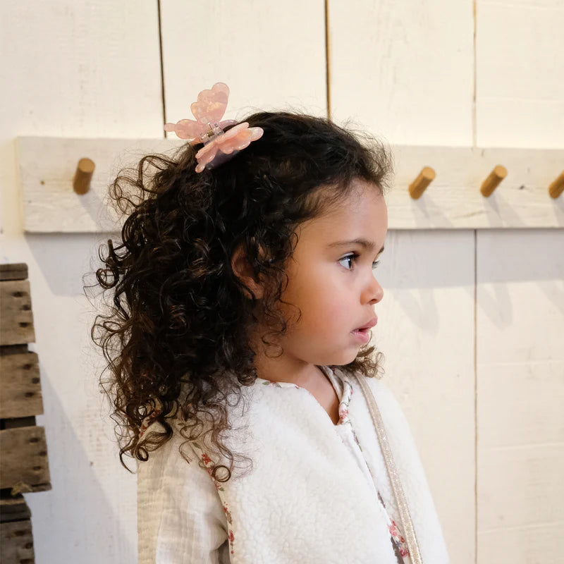Designed with little ones in mind, our shimmer butterfly claw clip adds a touch of whimsical charm to any hairstyle! Made in a shimmering pink acetate with little grippy teeth to hold hair in place whilst little ones twirl, spin and flutter like a little butterfly.