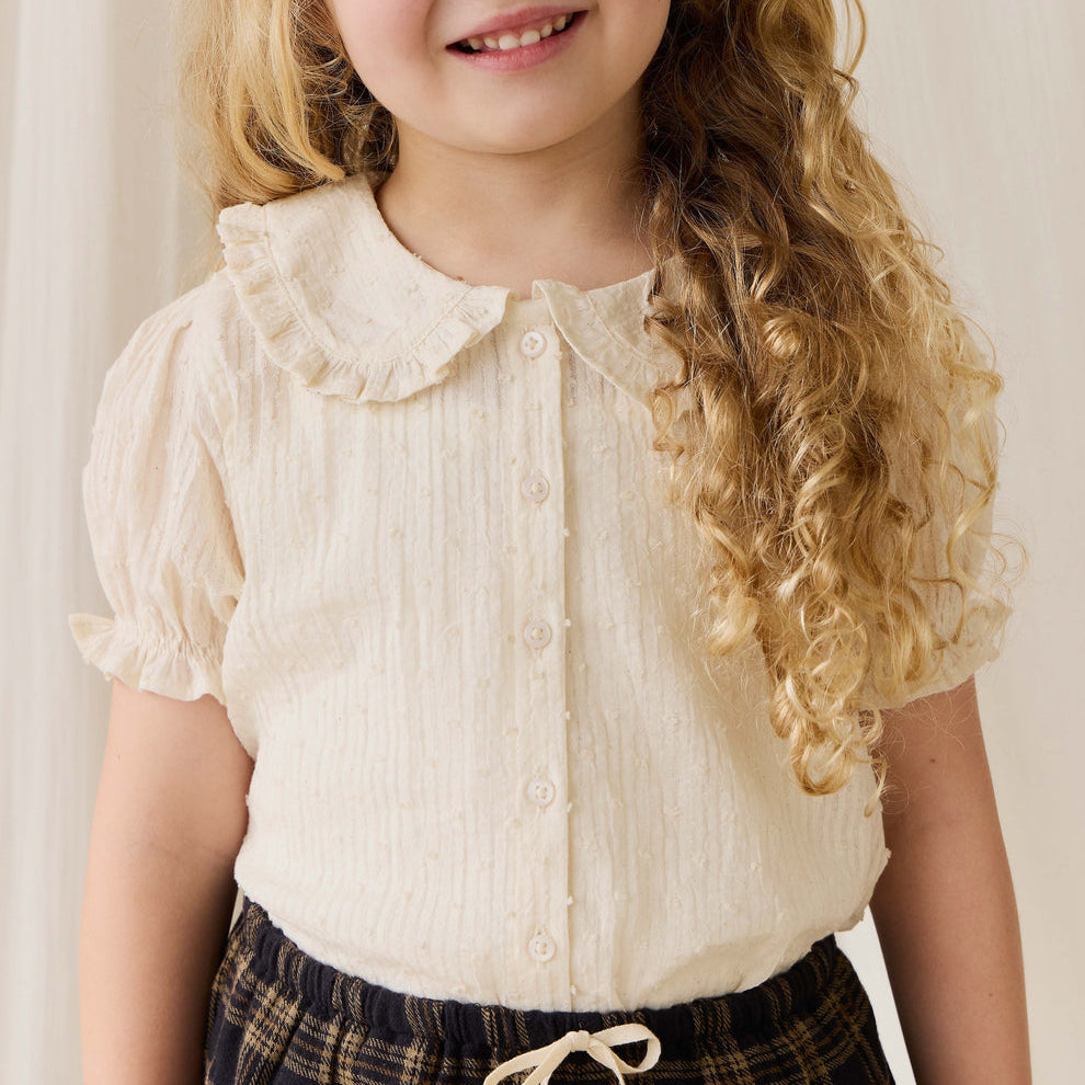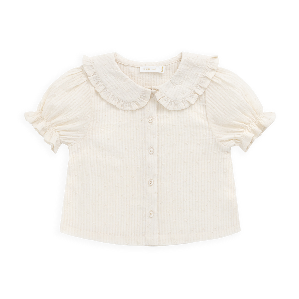 The Bowie Blouse in Parchment is a beautifully crafted piece designed for elegance and comfort. Featuring a soft neutral tone, charming ruffle collar, and puff sleeves with delicate gathers, this blouse is perfect for layering or wearing on its own for a classic look.