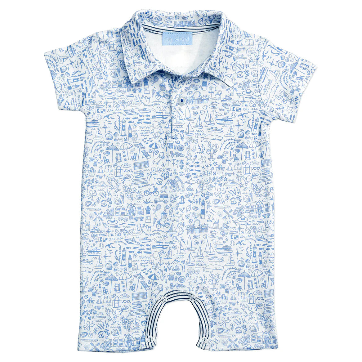 Enjoy sweet dreams of sunshine all year long with the help of our Seaside print in our Boy's Shortie Romper which features all of our favorite warmer weather traditions. Travel from the beach to your favorite clam shack to shuck some oysters and watch the sun set just beyond your favorite old light house. This print is sure to give you all of the summer time feels.