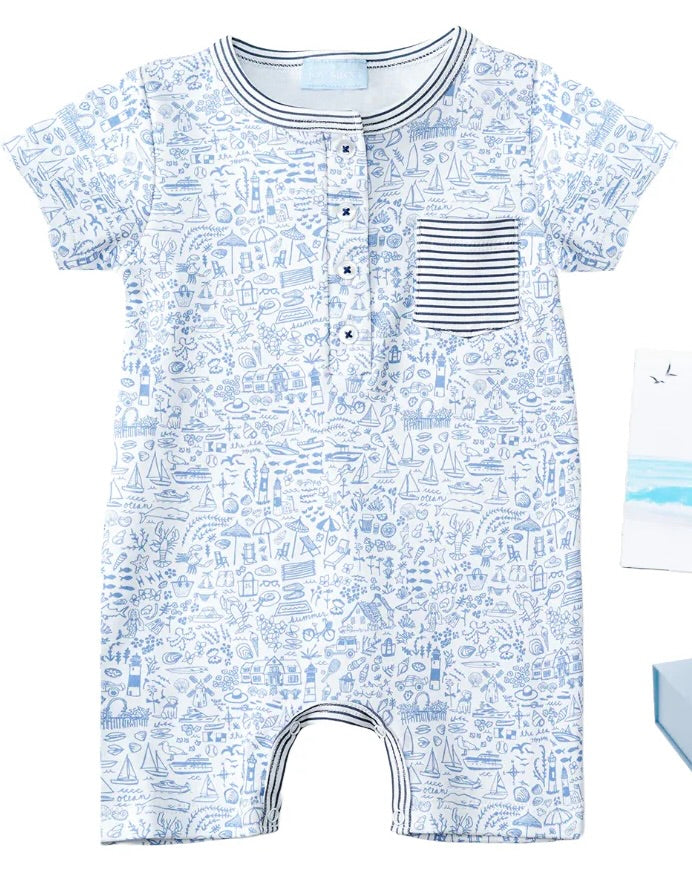 Enjoy sweet dreams of sunshine all year long with the help of our Seaside print in our Boy's Shortie Romper which features all of our favorite warmer weather traditions. Travel from the beach to your favorite clam shack to shuck some oysters and watch the sun set just beyond your favorite old light house. This print is sure to give you all of the summer time feels.