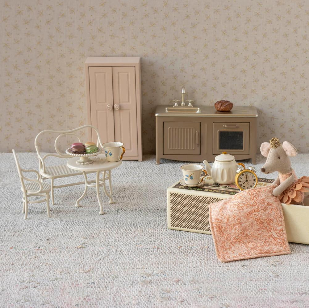 Café set furniture that fits the Little sister/brother and Big sister/brother mice. The set consist of a bench, a chair and a table, and is a perfect place for enjoying the afternoon sweets.