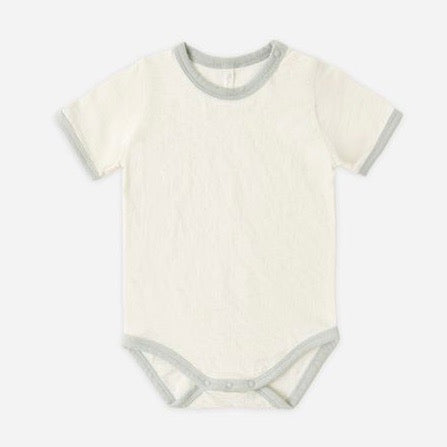 Short sleeved onepiece in our velvety soft brushed jersey knit with contrast ribbing and snaps at the shoulder and bottom for easy changes.