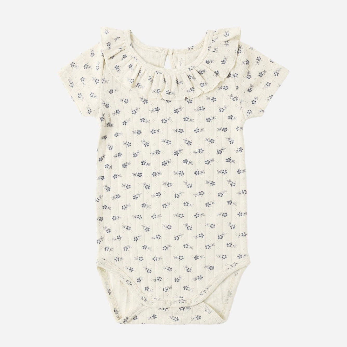 Short sleeve onesie, with a cute ruffled collar. All sizes have snaps at the inseam for easy changing.