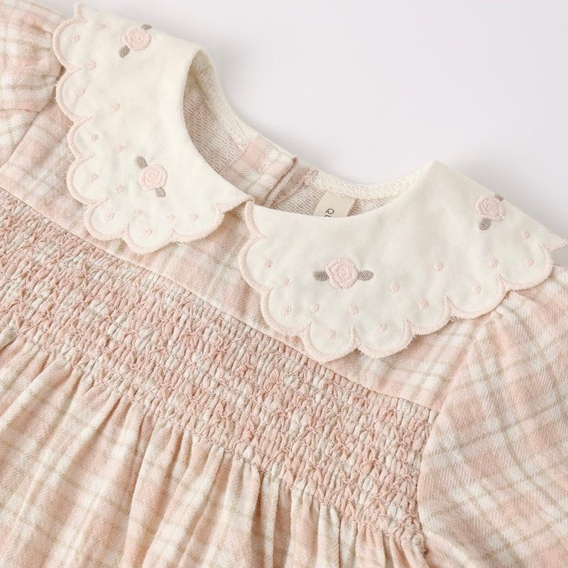 We are loving this precious style! The Callie Dress comes with an embroidered collar, smocked front, gathered skirt, long sleeves, and buttons at the back for easy wear. Matching bloomers included in all sizes.