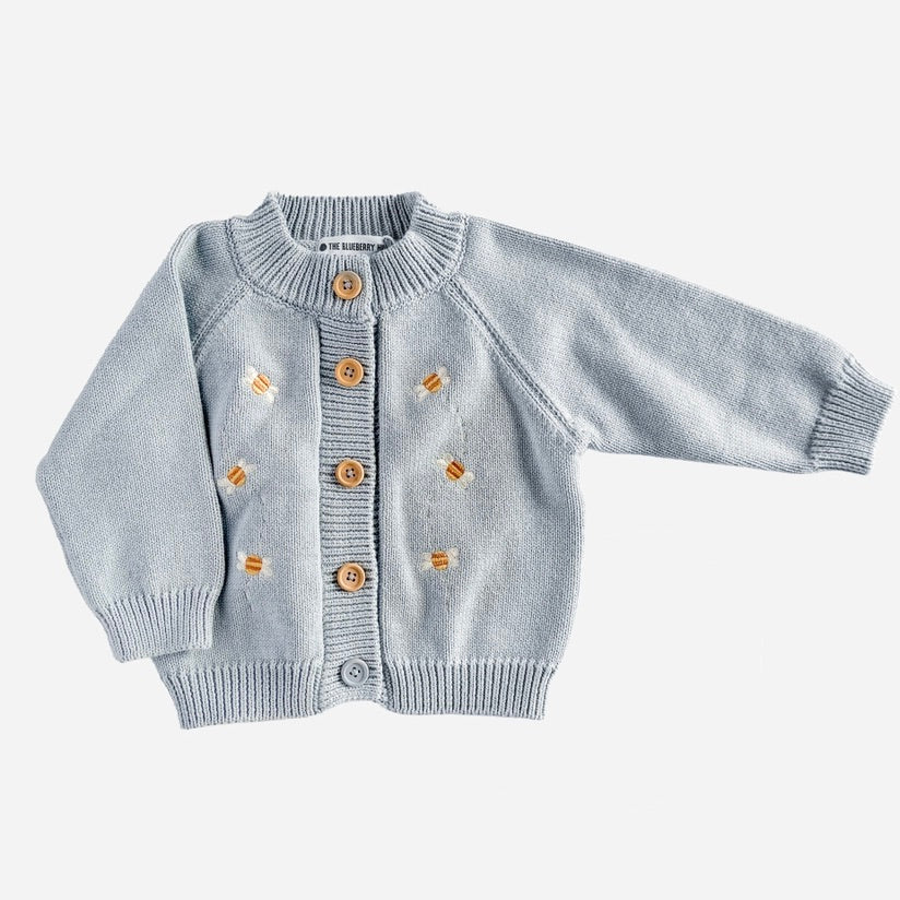 Buzz through the Blueberry Hill with our Cotton Bee cardigan. Featuring two lines of flying bees on a Blue cardigan.