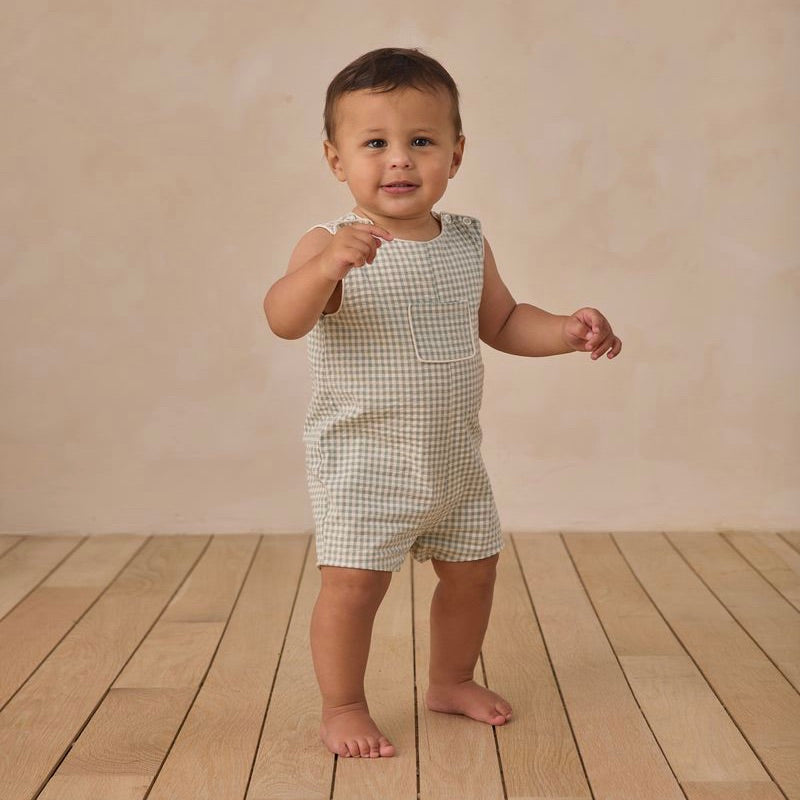 Our Georgie Romper is the sweetest look for your little gentleman. Designed with front pocket detail and buttons at the shoulders for easy changing.