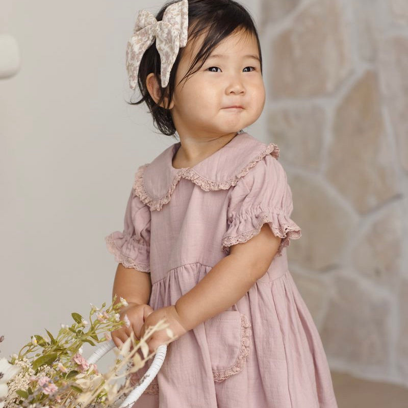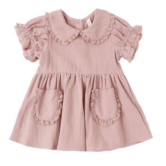 Our Marisol Dress features a Peter Pan collar, patch pockets, and full gathered short sleeves—all adorned with delicate lace ruffle trim—and coconut buttons at the back for easy dressing. Coordinating bloomers included with all sizes.