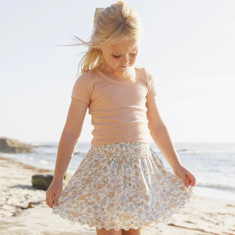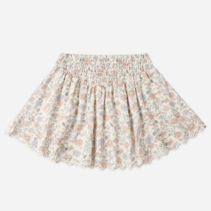 Smocked V Mini Skirt with a smocked waist and a scalloped hem.