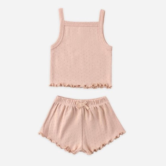 This pointelle set is a sure summer staple! Featuring a square neck tank top and shorts with an elastic waistband and bow detail.