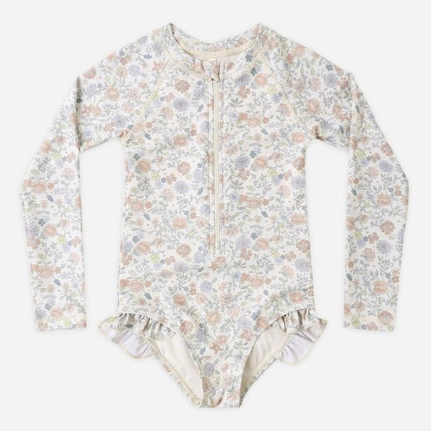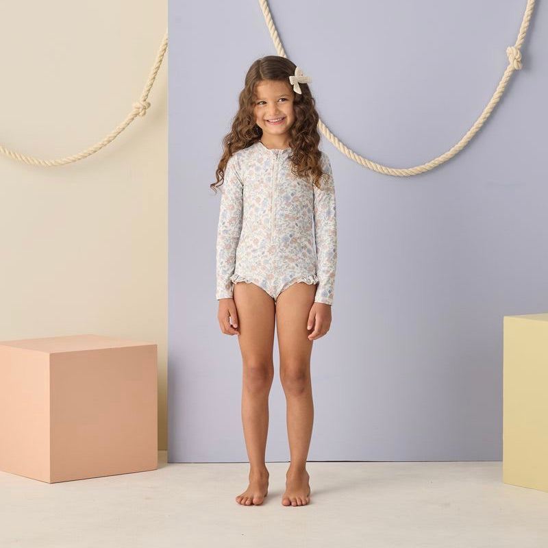 Longsleeves, ruffled bottoms, zip front, and a silky liner make this rash guard one piece a summer must-have.