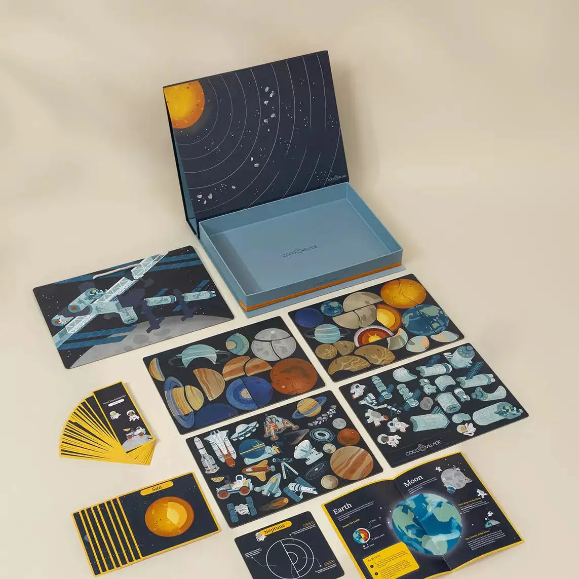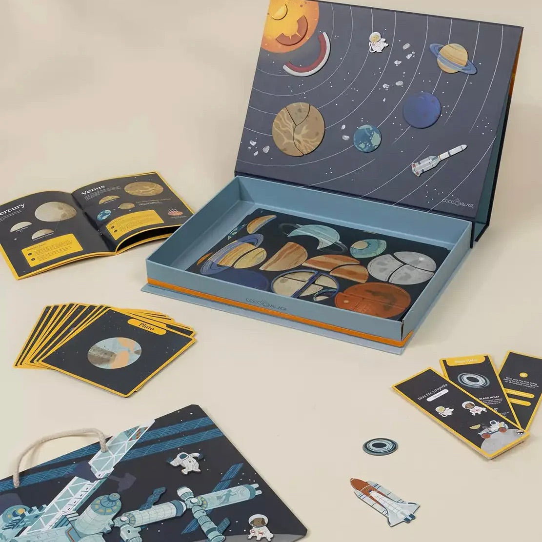 Interactive & Magnetic Encyclopedia – Space Discovery (English Version) Packed with fascinating facts and illustrations about the Sun and the planet of our solar system, this educational set is sure to spark your imagination. Dive into the wonders of space with interactive magnetic puzzles and a mini encyclopedia filled with fun Q&A discoveries. Awaken your inner astronaut: build your own International Space Station, explore the planets anf their unique structures, and find out exactly where we are in the vast universe.