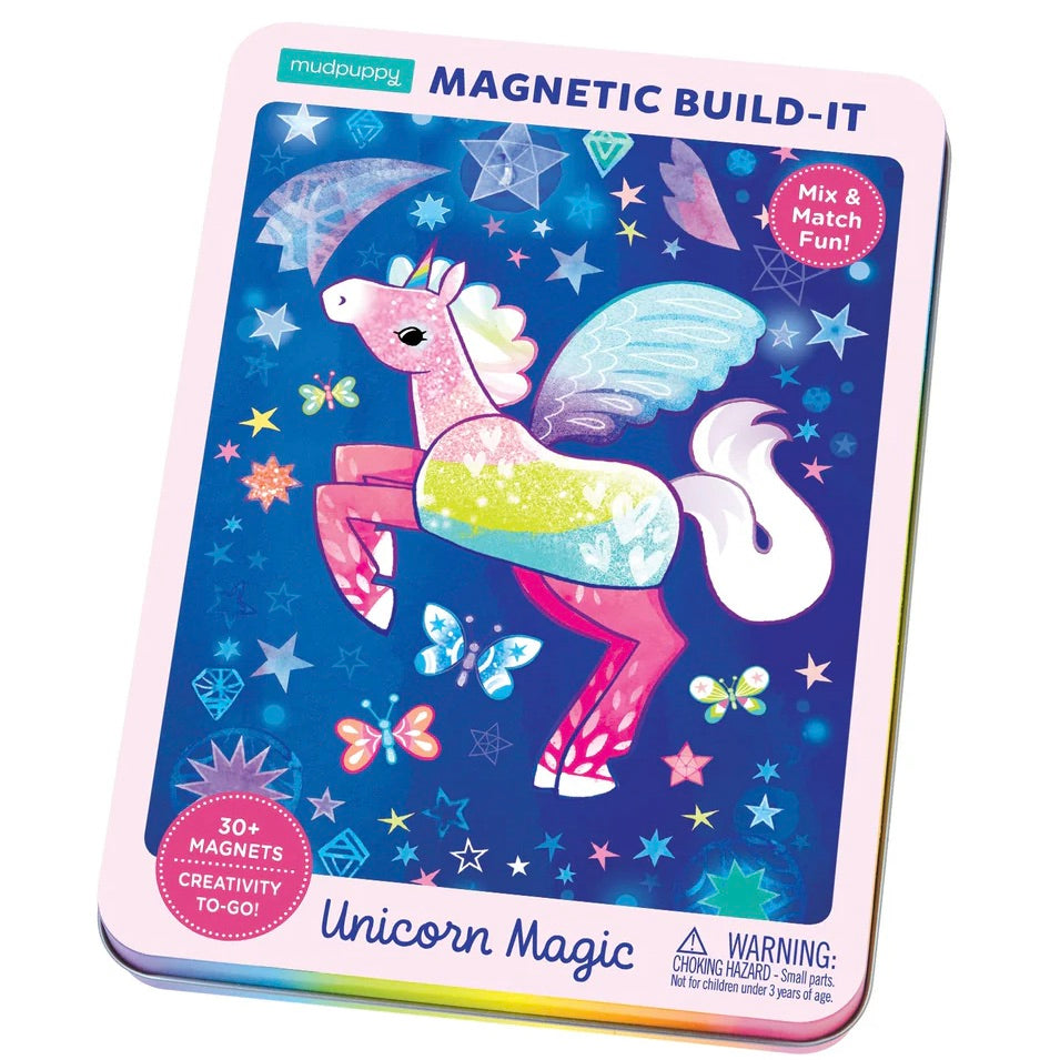Mudpuppy's Unicorn Magic Magnetic Build-It comes with 4 illustrated background scenes and 3 sheets of magnetic parts so you can build fantastical unicorn scenes! The sturdy tin package offers hours of imaginative play with easy cleanup and storage of pieces. Mudpuppy Magnetic Tins are the perfect children's travel toy and quiet time activity.