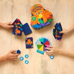 The Socktopus Octopus Shaped Box Game from Mudpuppy is an 8-legged twist on crazy 8's! Match the socktopus cards by color or pattern, but don't forget the silly actions. Perfect for family game night!