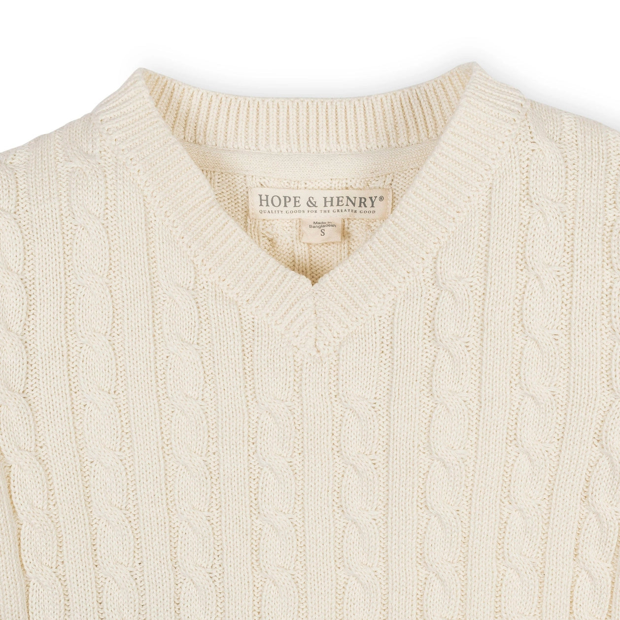 This goes-with-everything sweater is perfect for family photos and holiday parties alike. Features a v-neck with rib trim paired with a beautiful allover cable knit texture. Layers nicely with our collection of organic cotton button downs for a sophisticated look.