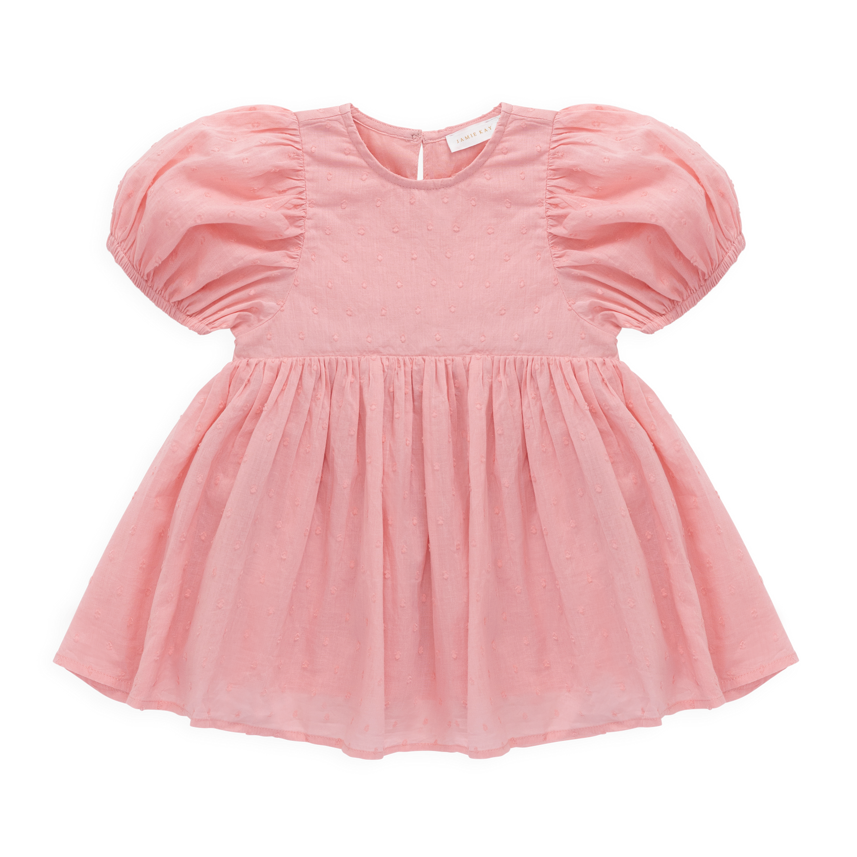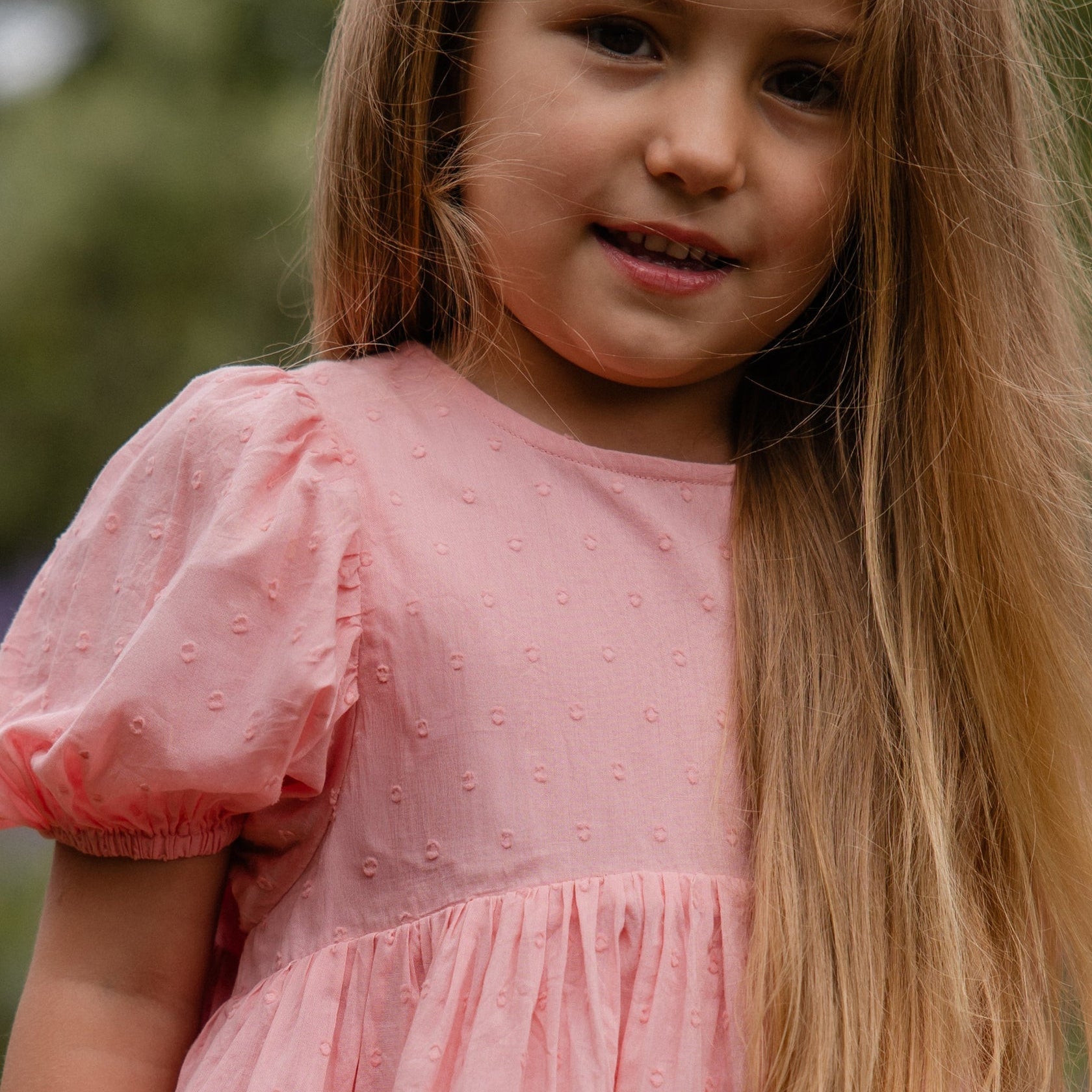 The Frannie Dress in our beautiful Swiss Pink hue is a timeless piece designed for comfort and elegance. Featuring puffed short sleeves, a softly gathered bodice, and a flowing skirt, this dress is perfect for warm days and special occasions. The subtle Swiss dot texture adds an extra touch of charm to this gorgeous design.
