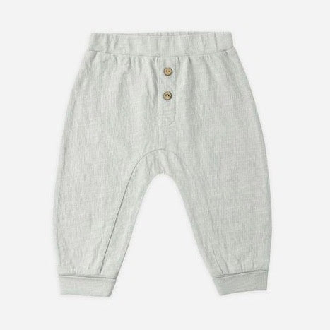 Soft cotton slub pants with coconut button detail at the front. Featuring rolled leg cuffs, an elastic waistband, and a dropped crotch.