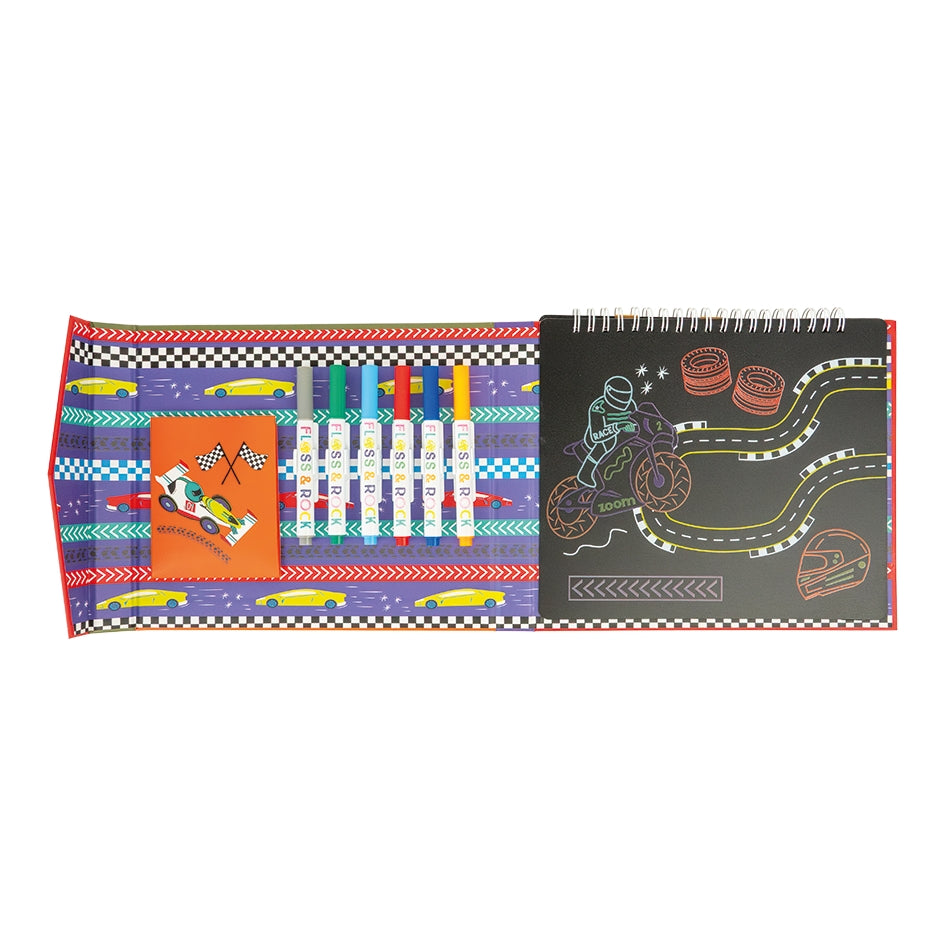 Chalk board fun in a wipeable sketchbook format! This brilliant Cars Chalk Board Sketchbook contains 8 pages. 5 pages with ready to colour-in illustrations featuring racing cars, monster trucks, trophies and more, plus 3 plain pages ready for freestyle doodling! There's also a tracing sheet and a super, Cars themed stencil sheet. Both these sheets can be removed and clipped into the spiral book bind wherever you choose! The sketchbook comes with 6 coloured chalk pens and a handy cleaning cloth to wipe the pages clean when you're finished, ready to start again and continue with your creativity next time! recyclable.