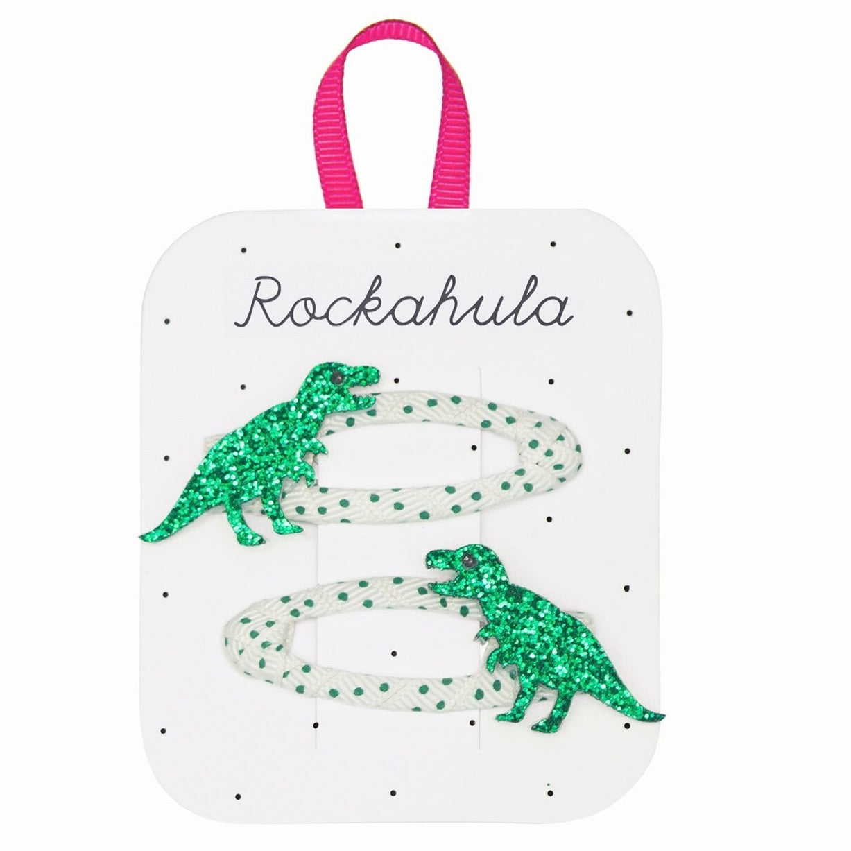 These two glittery dinosaurs on spotty grosgrain ribbon wrapped snap clips are perfect for any dinosaur lover! Totally roar-some! Matching ponies, sunhat, jewellery box and clip hanger also available. Not suitable for children under 36 months due to small parts.