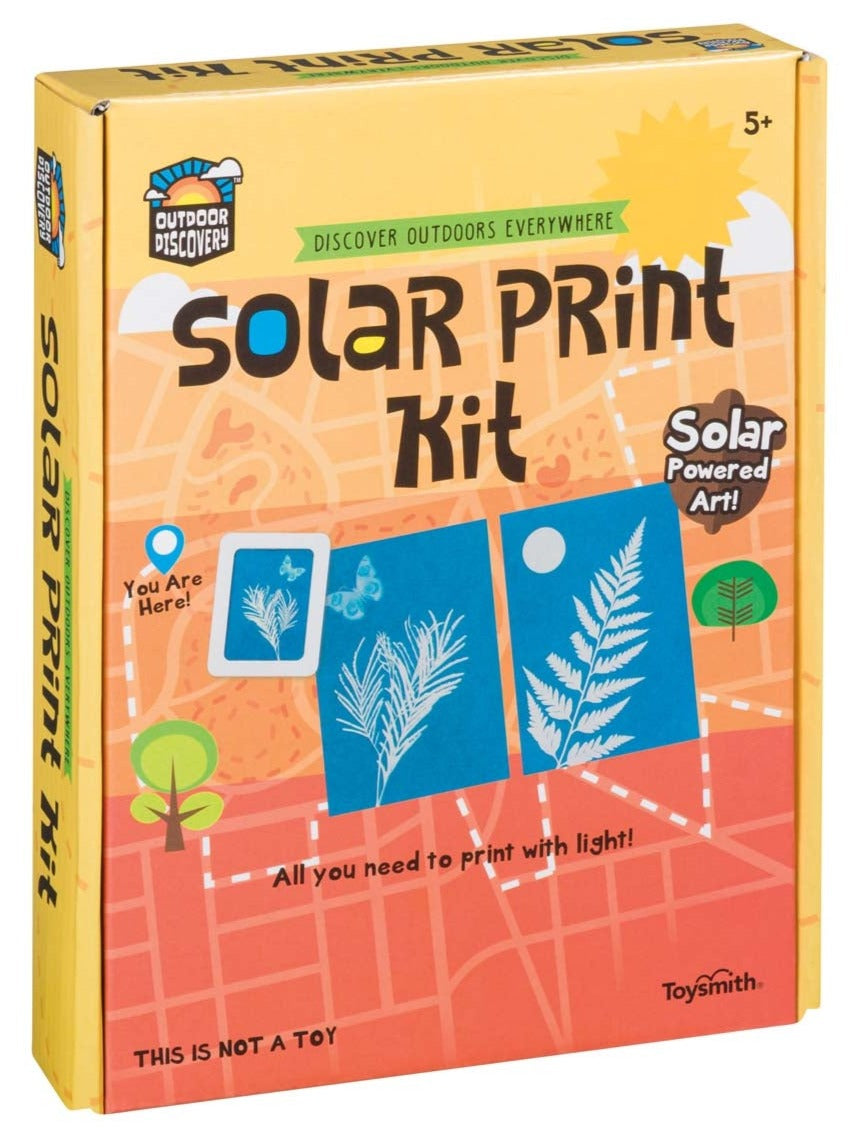 This kit contains everything needed to make solar prints. Includes three blank note cards with envelopes, two preprinted stencil sheets, two frames, twelve 5” x 7” sheets of solar print paper and instructions. 5yr+