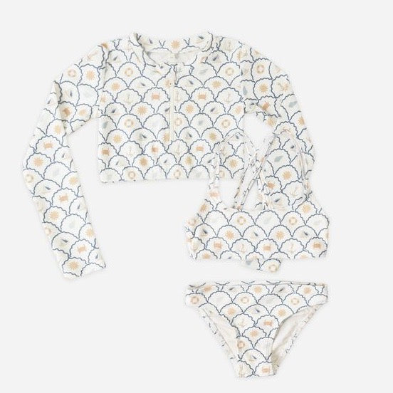 Our Crop Rashguard Set is the perfect look for your little surfer girls with a bikini top featuring criss-cross double straps and a v-neckline, matching bottoms + a coordinating cropped rashguard featuring a functional front zipper for easy wear.