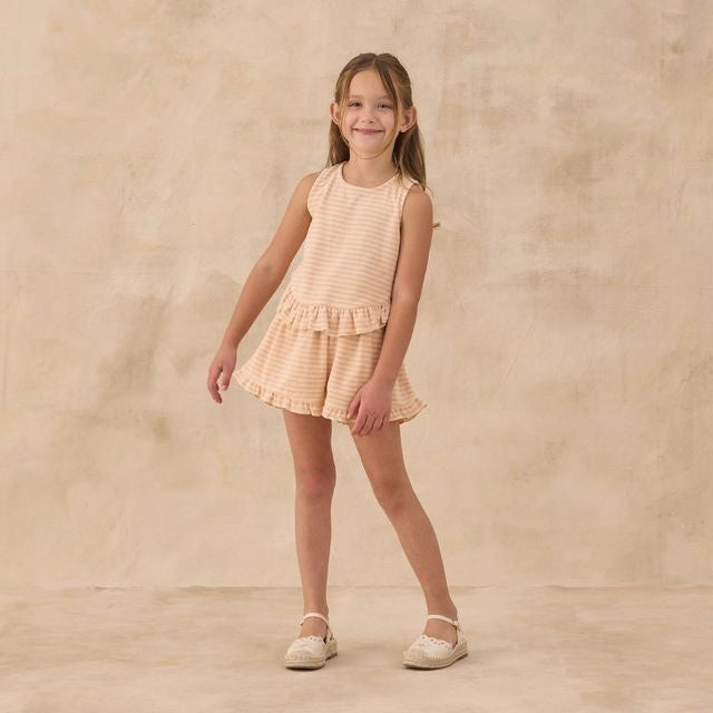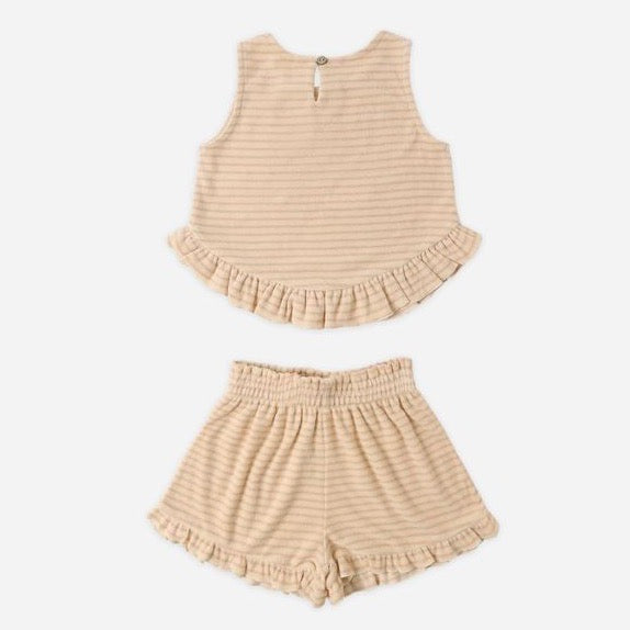 This terry cloth set features a scoop neck tank with bottom ruffle detail and matching shorts with an elastic waistband and a wide leg fit for a relaxed and breezy look.