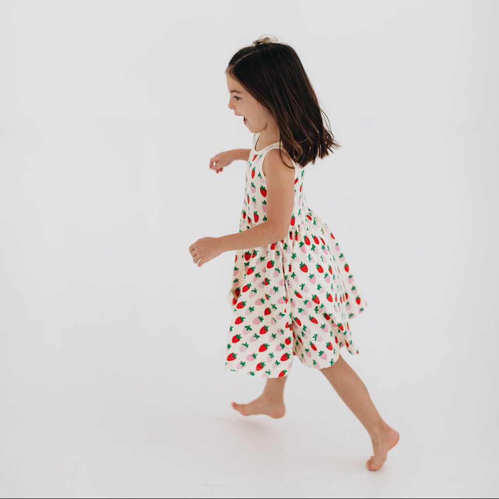 The signature Good Apples dress is made with stretchy-soft organic cotton and features a scooped back, pockets for all their treasures, and a full circle skirt made for twirling.