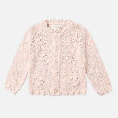 Our Knit Cardigan in it's love era with a lovely heart bobble knit, scalloped trim, and faux shell buttons for an extra sweet look.