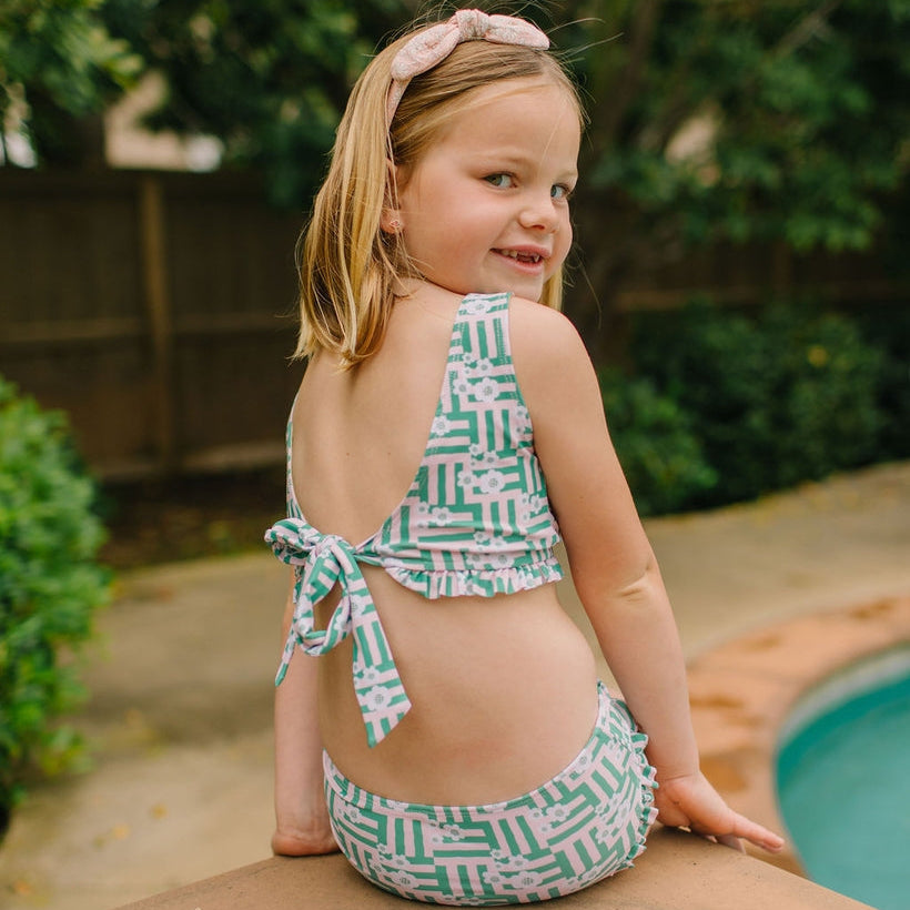 The Monroe swimsuit is a charming two-piece set featuring a tie-back top with a high neckline and a scooped back. Long, ribbon-like ties create a beautiful, low bow that adds a delicate finishing touch. Both the top and the detached bottoms are adorned with playful ruffled details—the bottoms featuring a ruffle along the leg openings for added flair. Made with UPF 50 protection, this suit is perfect for stylish, sun-safe fun.