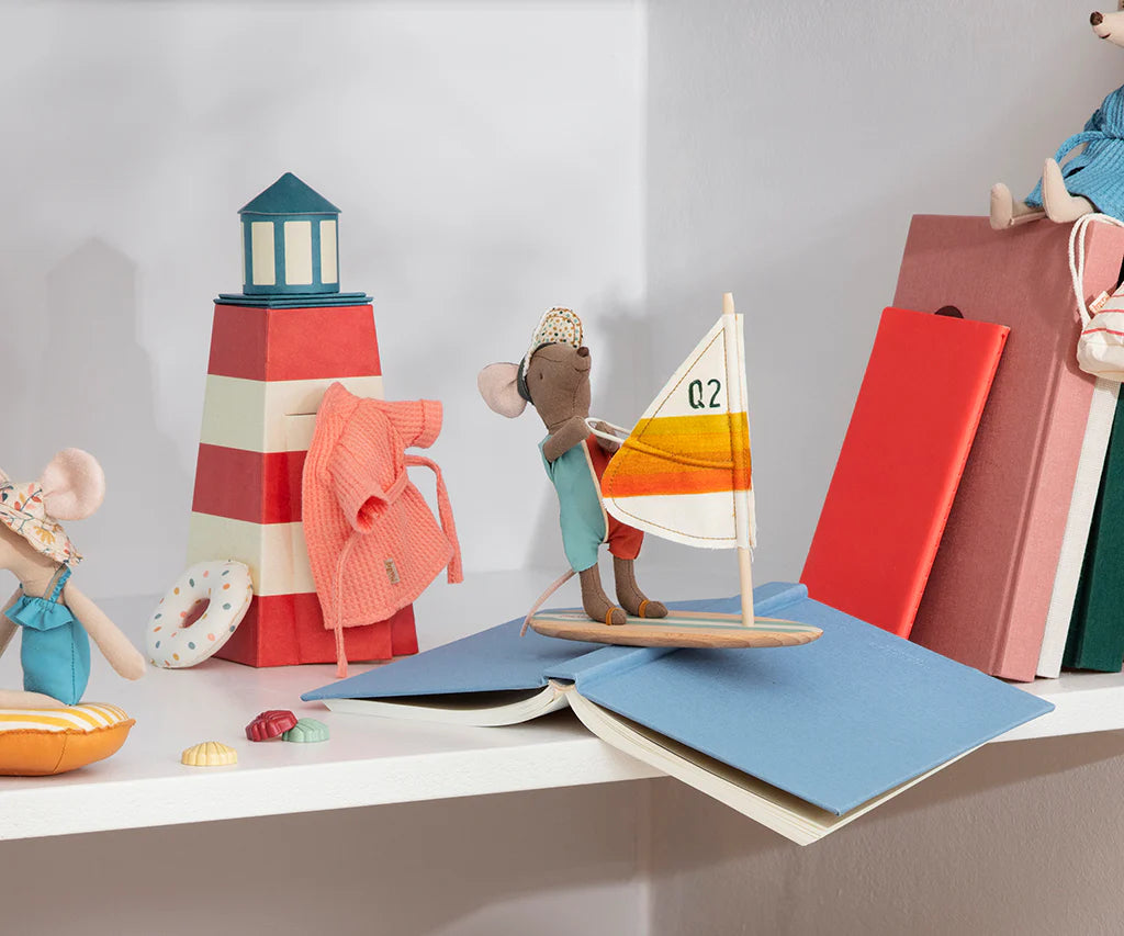 Surfer big brother is the instructor for his two pupils: little brother and sister surfer mice. He’s wearing an instructor wetsuit that is dusty red and aqua. The wetsuit keeps him safe and warm in the cool water and waves. He also has a speckled visor to keep the sun out of his eyes so he can see. His wooden surfboard has mint blue and white stripes with a colorful ‘Q2’ sail. The board includes two elastic straps at the bottom so he can keep his feet in place. Big brother surfer also has magnetic hands, so he can steer his sail wherever he wants to go!