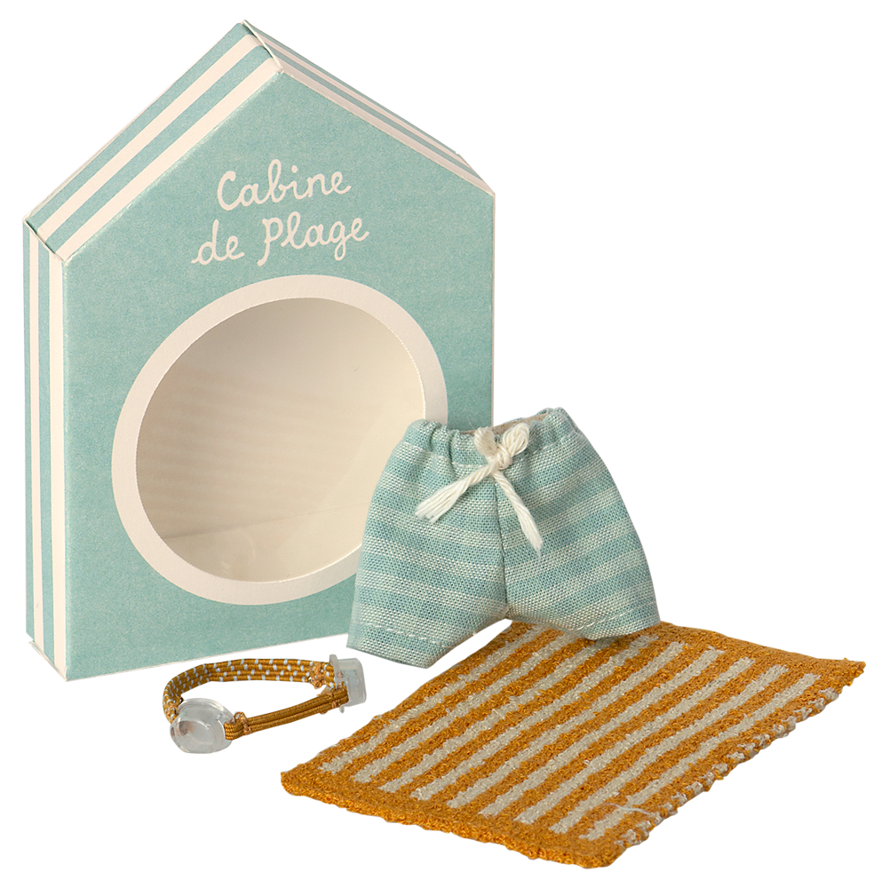 Vacation time. This set includes all essential accessories for a fun day at the beach: trunks, goggles, and a towel. It all fits the mice in size big brother/sister perfectly.