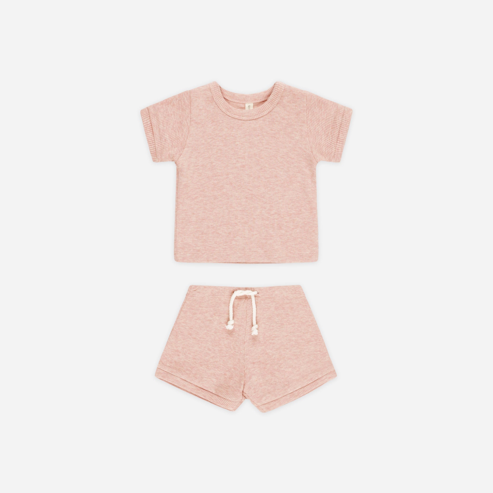 Our Shortie Set in our ribbed melange knit is a must-have for your little one's lounge and play wardrobe, featuring a cozy tee and coordinating shorts with an elastic waistband.