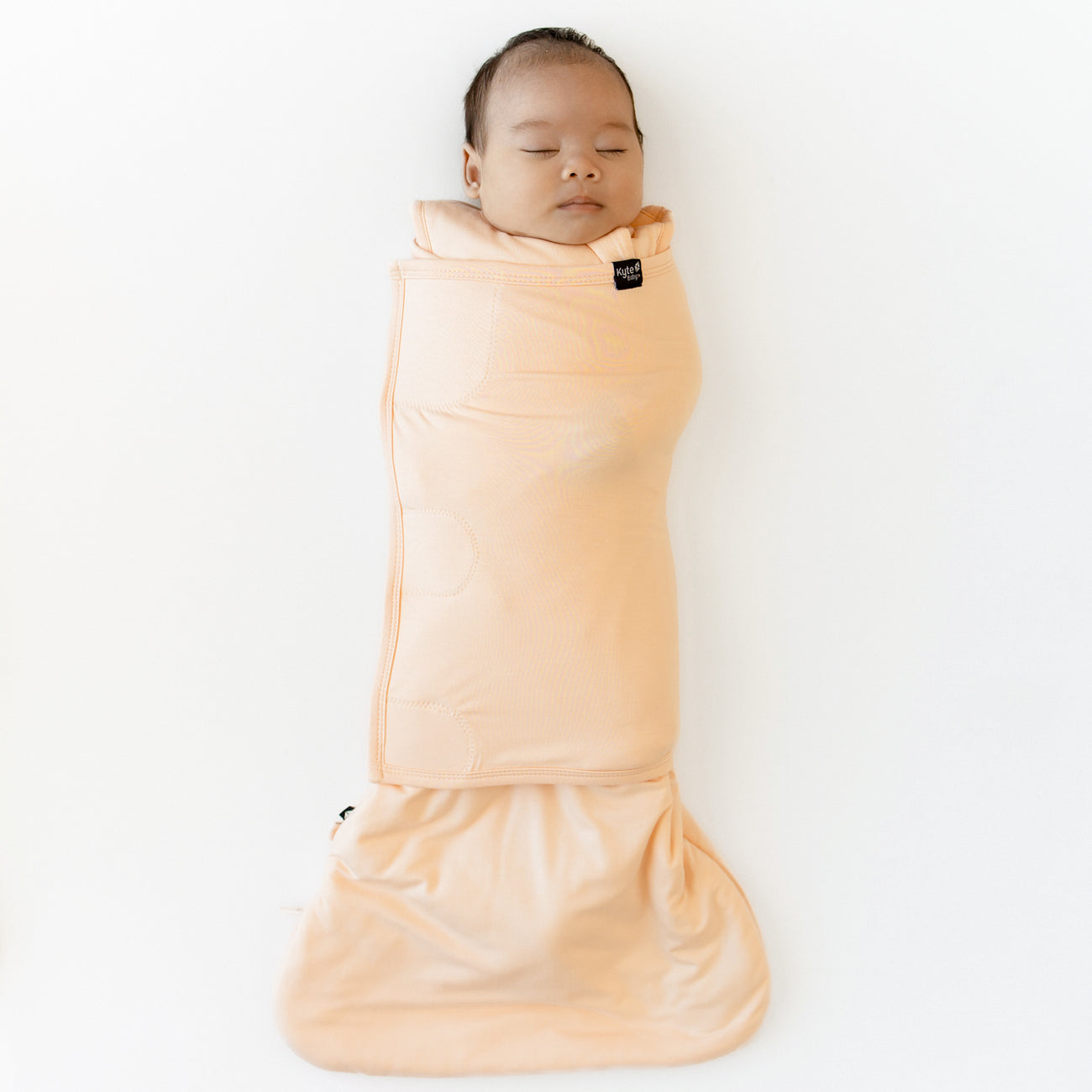 Our Sleep Bag Swaddler is an all-in-one sleep system that comforts your baby from the newborn stage to the next. Made from our signature bamboo rayon, our patent-pending sleep bag swaddler functions as both a swaddle and a 1.0 sleep bag. The attached swaddle wrap features a Velcro closure for a secure and adjustable fit, and is fully removable once swaddling is no longer recommended. There’s also a removable elastic loop that is fastened with a snap closure that can be placed around the bottom of the sleep bag. The additional step of tightening the sleep bag helps for little ones who haven’t fully grown in to their new sleep bag yet. Underneath the wrap is our award-winning sleep bag.
