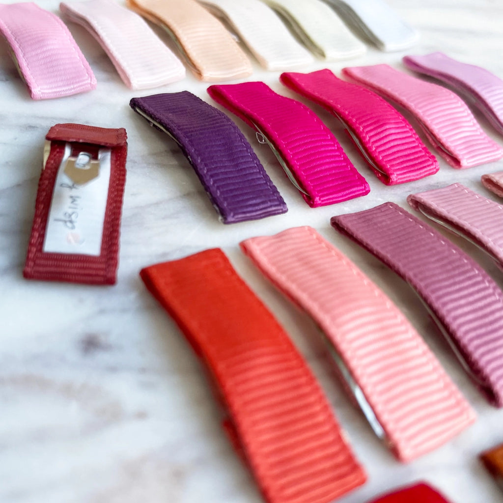 Non patterned solid grosgrain ribbon covered snap clip barrettes for wispy fine hair. Snap clips wrapped in different color ribbons. No patterns for those looking for simple and basic ribbon covered clips to hold back fly aways! Perfect for sweeping that fringe away!