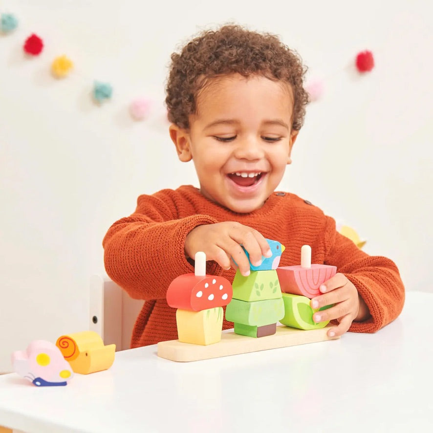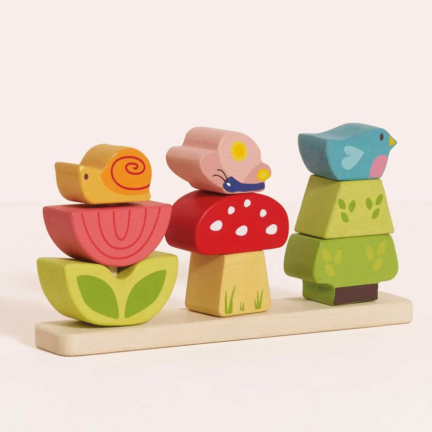 A charming wooden toy with 9 colorful pieces to stack. Budding nature lovers will adore this sweet educational toy, perfectly sized for little hands and developing imaginations. Build the toadstool, tree and flower and top with a little garden friend. Painted in lovely vibrant colors, this fun and versatile toy encourages little ones to stack and sort thus developing their fine motor skills and improving dexterity and hand-eye coordination. Our educational toys promote sensory learning through colours, sounds, and textures that foster curiosity in young, developing minds.